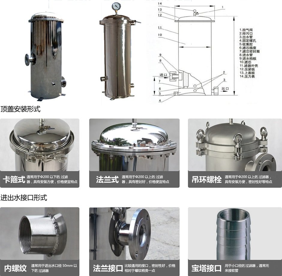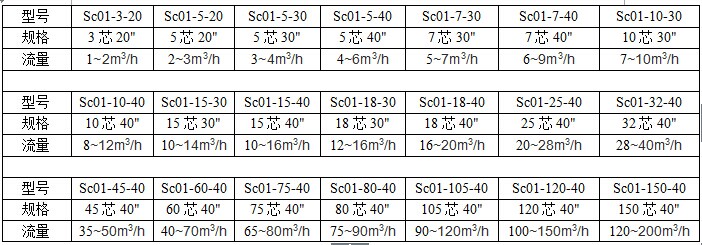 保安过滤器一般用在石英砂过滤器,活性炭过滤器,离子交换器后面,一方面是 进一步处理水中细小的杂质,另一方面防止前道工序里破碎石英砂、活性炭,离子交换 通过布水器留到下道工序。 1、熔喷滤芯,特点:价格低廉,孔径一般在3um以上,市场用量大。 2、线绕滤芯 特点:价格低廉,孔径一般在3um以上,可以清洗后重复使用。 3、折叠滤芯 特点:精度高,成本高,一般用在纯水后续处理。 四、保安过滤器选型尺寸规格 五、保安过滤器选型参数